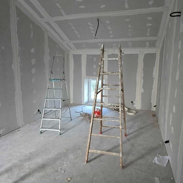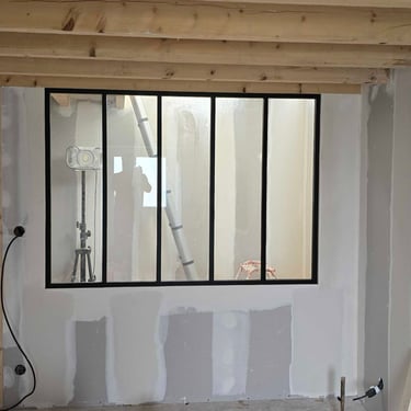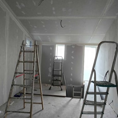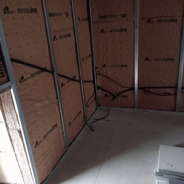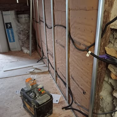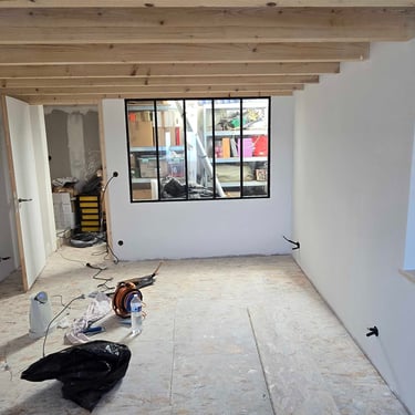 Création d’un aménagement intérieur en plaques de plâtre dans une grange, avec isolation et réalisation des bandes de finition.
