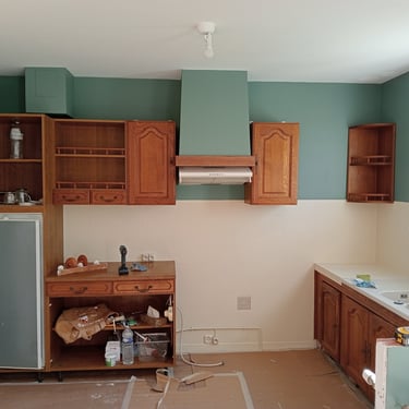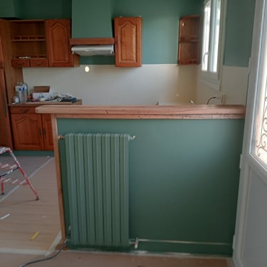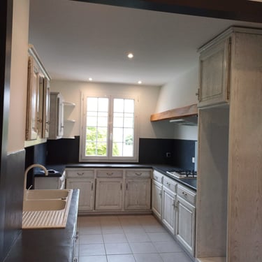 Préparation des supports par ratissage à l’enduit des murs et plafonds, puis application d’une peinture dans une teinte sobre afin de rester en harmonie avec les éléments de cuisine conservés.