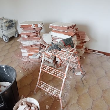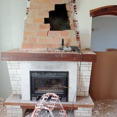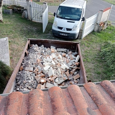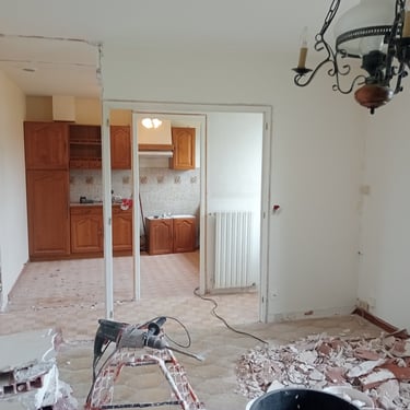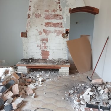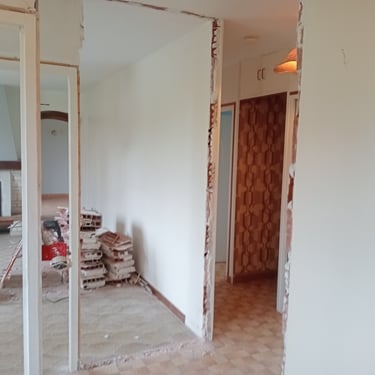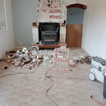 Dépose d’une cheminée et démolition de cloisons en briques pour ouverture de l’espace, avec évacuation des gravats.