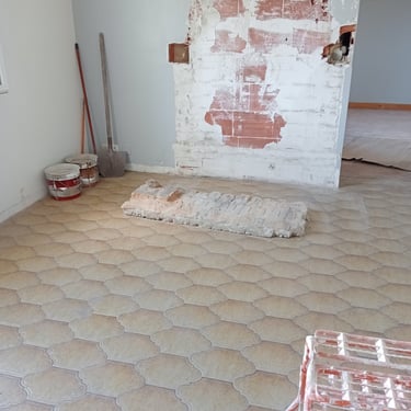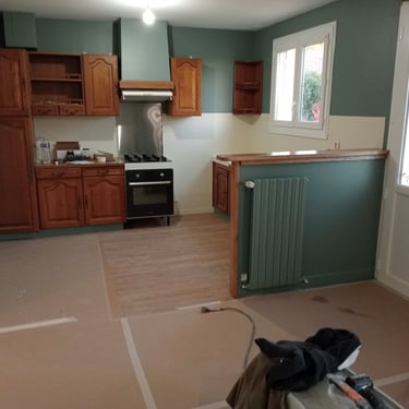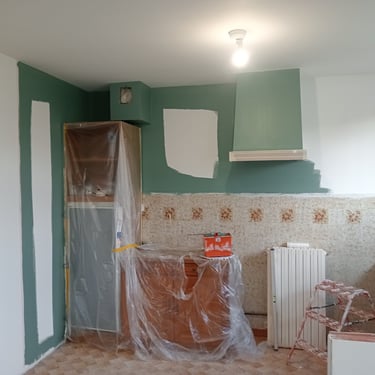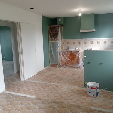 Préparation du chantier : protection des sols et des meubles de cuisine conservés avant l’application des peintures.